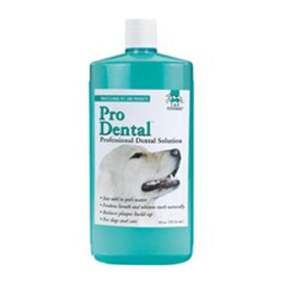 Eliminates bad breath and plaque build-up by simply adding it to pets' drinking water. Formulated with organically-derived chlorophyll and stabilized chlorine dioxide to freshen breath. Added whitening agent brightens teeth. Add one teaspoon to 8 oz of water daily to help reduce plaque build-up for healthier teeth and gums. Safe for use on dogs and cats. ProDental®Solution comes in a 16 oz size.