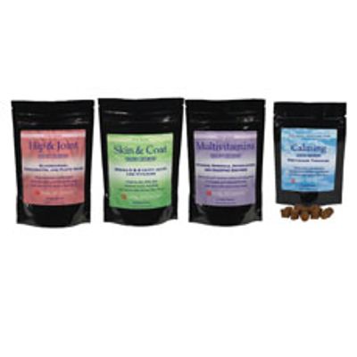 Total Pet Health™ Soft Chews are soft, great-tasting dog supplements that are tastier and easier to chew! Choose from four different pet health supplements, including formulas for calming, hip and joint, skin and coat, and multivitamins. These popular pet health supplements are now available in a new chewable form with a chicken liver taste. The calming formula soothes and stabilizes anxious pets. Hip and joint supplement features glucosamine, MSM, and chondroitin to promote joint health. The multivitamin formula is a complete vitamin and mineral supplement with digestive enzymes and antioxidants. Skin and Coat formula has Omega 3, 6, and 9 fatty acids to support a shiny coat and healthy skin.